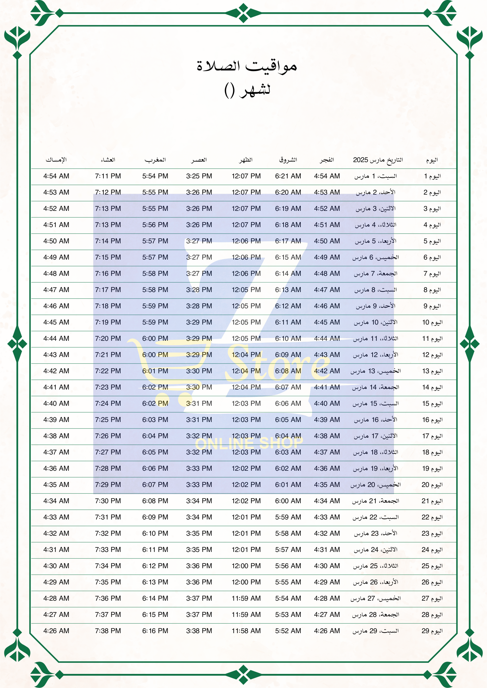 تصميم مواقيت الشهرية للصلاة بأسم من تحب